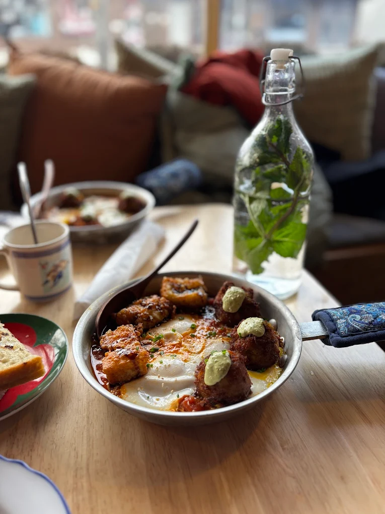 Absolutely loved the halloumi shakshouka for breakfast! One skillet is enough for two people. Only issue I had was that the tables were too low compared to the chairs. Made it awkward to eat leaning forward.